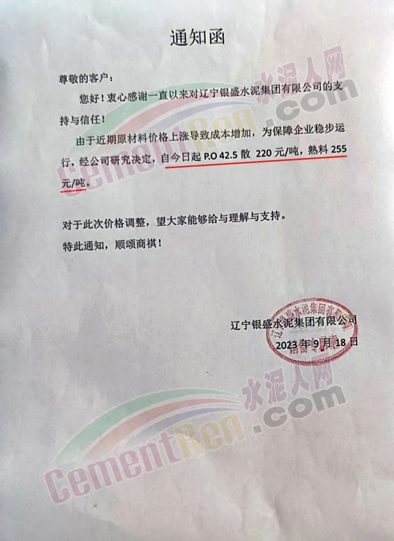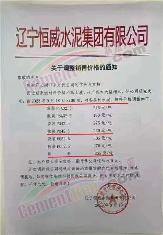 遼寧恒威水泥集團(tuán)有限公司通知,因近期原燃材料價格不斷上漲,生產(chǎn)成本大幅增加,經(jīng)公司研究決定:自2023年9月18日8:00起,對各品種水泥、熟料價格調(diào)整。調(diào)整后熟料報價255元/噸,散裝P.O42.5水泥報價220元/噸。