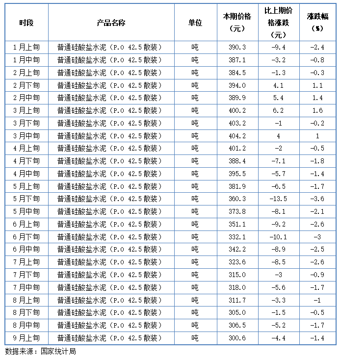 根據(jù)統(tǒng)計(jì)局?jǐn)?shù)據(jù)顯示,9月上旬33類產(chǎn)品較年內(nèi)低點(diǎn)調(diào)漲,而同期水泥價(jià)格卻持續(xù)下滑,連續(xù)半年創(chuàng)近5年低點(diǎn)紀(jì)錄。