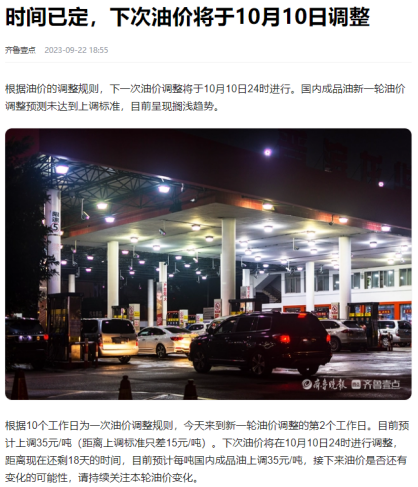 近來(lái)有消息稱,下一輪油價(jià)將于10月10日進(jìn)行調(diào)整。根據(jù)10個(gè)工作日為一次油價(jià)調(diào)整規(guī)則,目前預(yù)計(jì)上調(diào)35元/噸(距離上調(diào)標(biāo)準(zhǔn)只差15元/噸)。下次油價(jià)將在10月10日24時(shí)進(jìn)行調(diào)整。距離現(xiàn)在還剩10幾天的時(shí)間,目前預(yù)計(jì)每噸國(guó)內(nèi)成品油上調(diào)35元/噸。