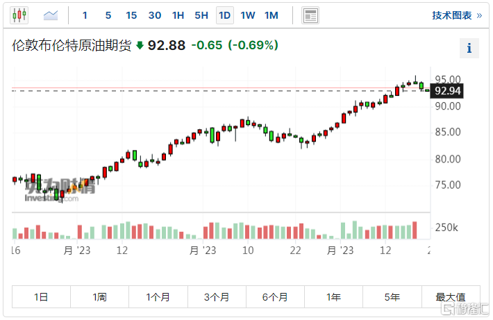 由于沙特阿拉伯和俄羅斯分別宣布延續(xù)減產(chǎn)減供措施,國(guó)際石油庫(kù)存走低推升了供不應(yīng)求的焦慮心態(tài)。近期國(guó)際油價(jià)盤(pán)中一度創(chuàng)下10個(gè)月以來(lái)新高,美油一度漲至93美元/桶,布油也一度突破95美元/桶。自今年6月以來(lái),布倫特原油價(jià)格累計(jì)上漲超28%。