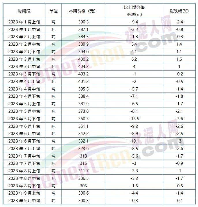 從近期國(guó)家統(tǒng)計(jì)局公布的數(shù)據(jù)可見(jiàn),流通領(lǐng)域水泥價(jià)格連續(xù)下跌已放緩。流通區(qū)域普通硅酸鹽水泥(P.O42.5散裝)9月中旬報(bào)價(jià)300.3元/噸,為年內(nèi)最低價(jià)。且從3月下旬開(kāi)始連續(xù)18期下跌,從5月上旬開(kāi)始連續(xù)14期創(chuàng)年內(nèi)低點(diǎn)。較本年高點(diǎn)404.2元/噸,相差103.9元/噸??上驳氖墙诘照?.1%,為年內(nèi)最低跌幅,這也意味著即將回升的趨勢(shì)。