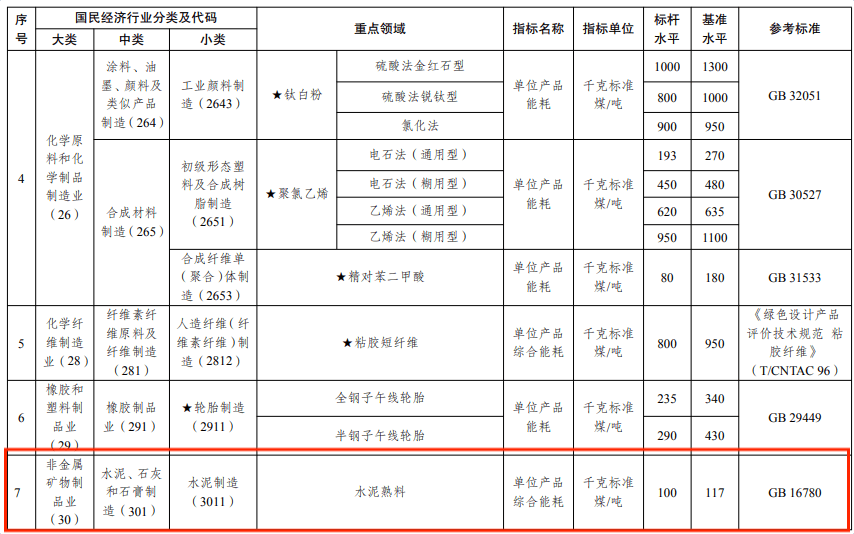 通知中對此前明確的水泥熟料等25個(gè)領(lǐng)域,原則上應(yīng)在2025年底前完成技術(shù)改造或淘汰退出,并規(guī)定水泥熟料單位產(chǎn)品綜合能耗標(biāo)桿水泥為100千克標(biāo)準(zhǔn)煤/噸,基準(zhǔn)水平為117千克標(biāo)準(zhǔn)煤/噸。
