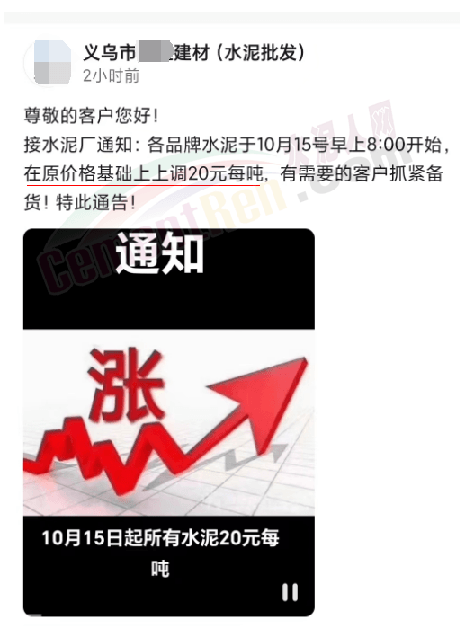 日前,浙江義烏市一水泥批發(fā)商發(fā)通知給客戶稱:接水泥廠通知,各品牌水泥于10月15日早上8時(shí)上調(diào)20元/噸,有需要的客戶抓緊備貨。