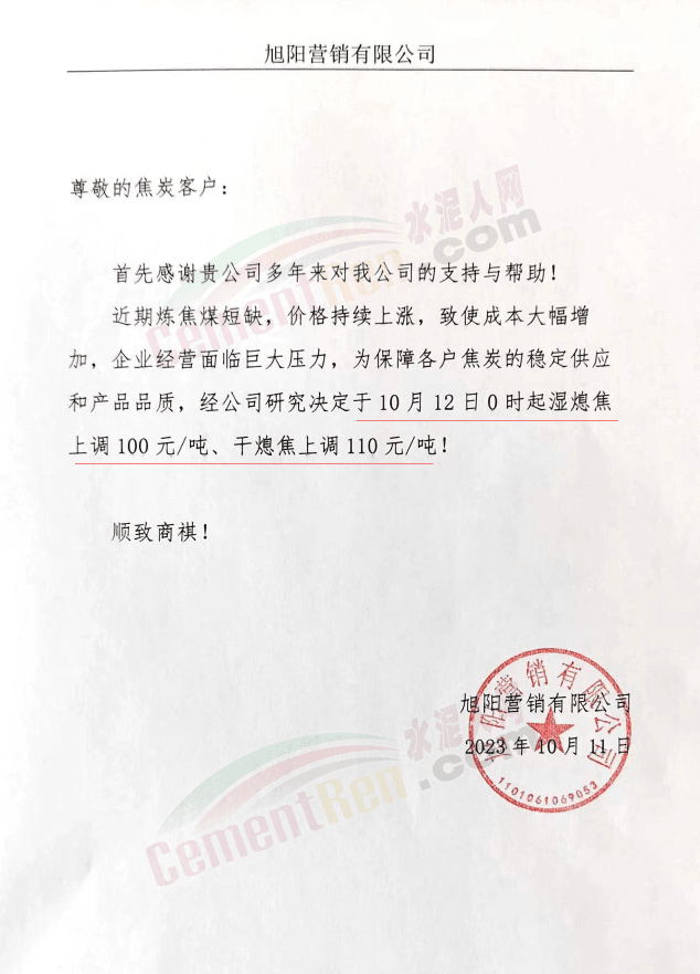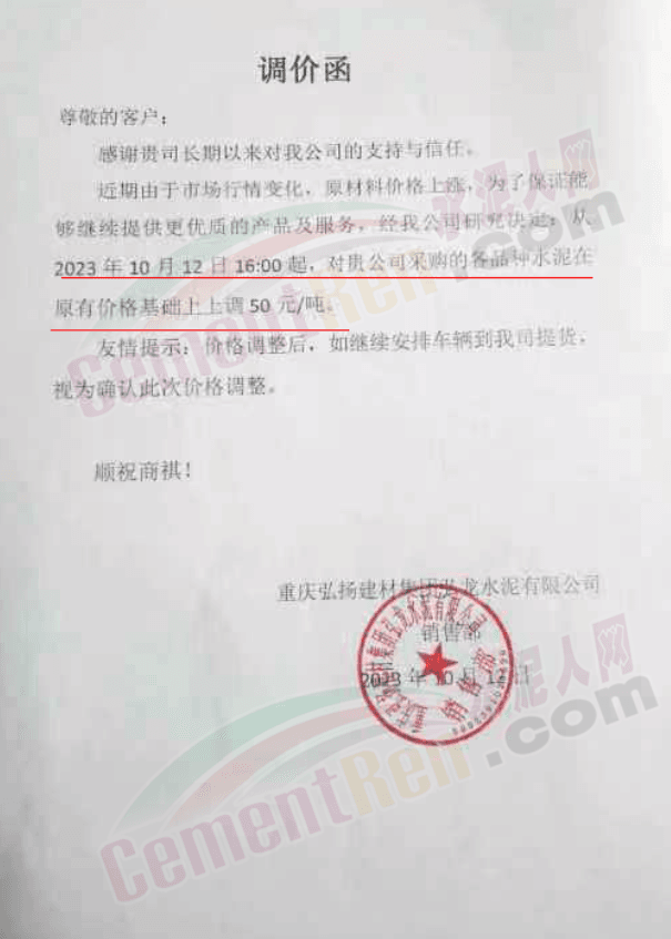 重慶弘揚(yáng)建材集團(tuán)衛(wèi)龍水泥有限公司通知稱,近期由于市場行情變化,原材料價(jià)格上漲,為了保證能夠繼續(xù)提供優(yōu)質(zhì)的產(chǎn)品及服務(wù),經(jīng)公司研究決定,從10月12日16時(shí)起,對(duì)公司采購的各品種水泥在原有價(jià)格基礎(chǔ)上上調(diào)50元/噸。