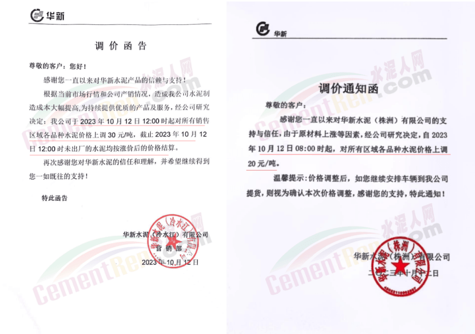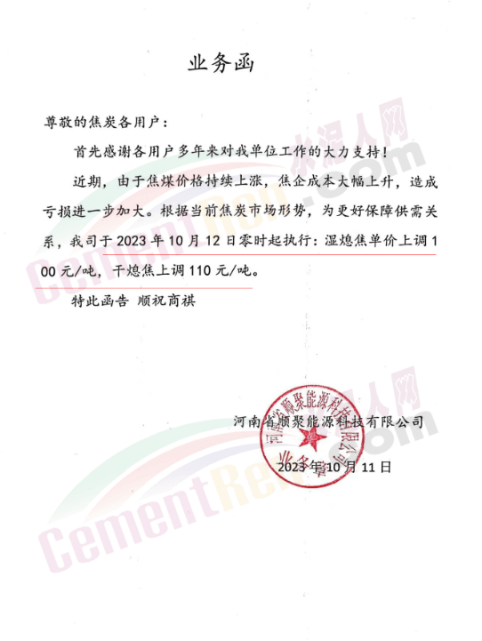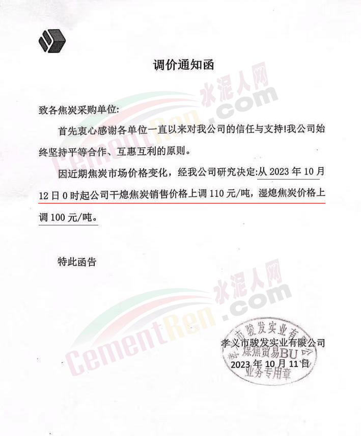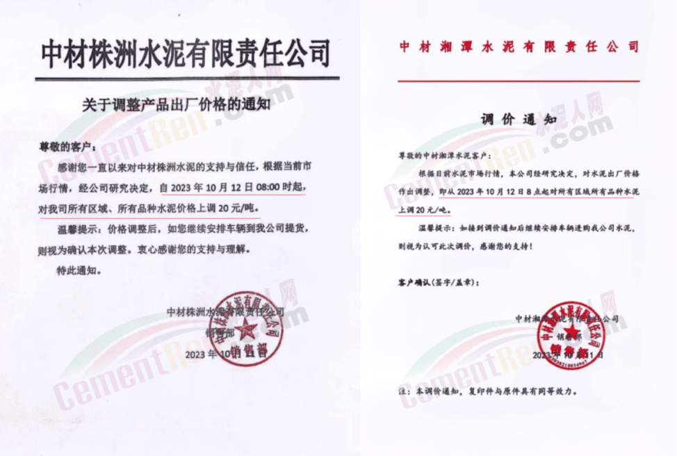 遼寧某混凝土企業(yè)通知,因水泥漲價(jià),混凝土報(bào)價(jià)上調(diào)10元/噸。