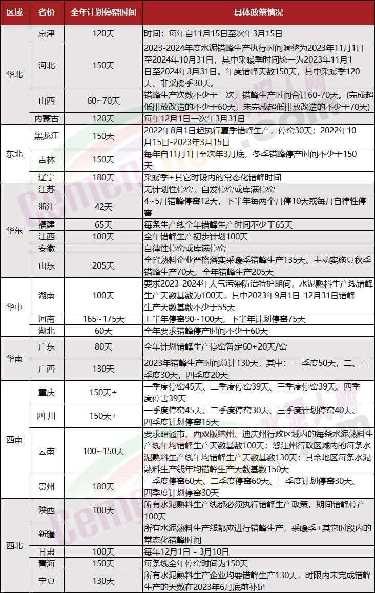 山西省,要求水泥行業(yè)2023年11月15日至2024年3月15日,全年合計(jì)錯(cuò)峰停窯180~190天。
