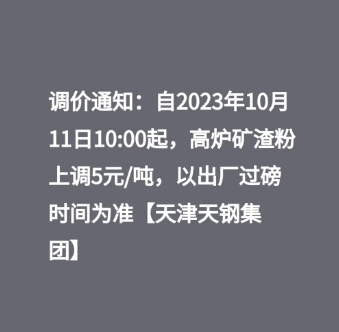天鋼集團(tuán)通知:自10月11日10時(shí)起,高爐礦渣粉上調(diào)5元/噸。