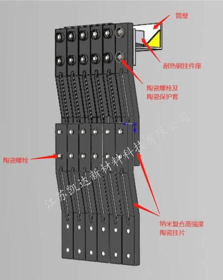 采用多種陶瓷復(fù)合材料,經(jīng)過1800℃左右高溫?zé)Y(jié)而成,使用溫度可達1500℃。具有耐高溫、抗沖刷、耐腐蝕、抗結(jié)皮、抗震性穩(wěn)定、重量輕、施工安裝方便。結(jié)構(gòu)上,掛片與底座采用特種高溫耐腐螺栓鏈接,耐熱鋼螺帽的外部采用碳化硅陶瓷保護套家耐火膠泥進行保護;底座與掛條之間加多晶棉,翻盤華處理,是安裝結(jié)構(gòu)更為合理;掛片底部采用陶瓷螺栓與陶瓷鏈接板進行雙鏈接,使其整合內(nèi)筒更加牢固。