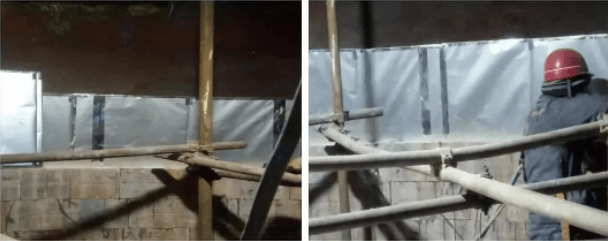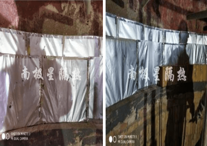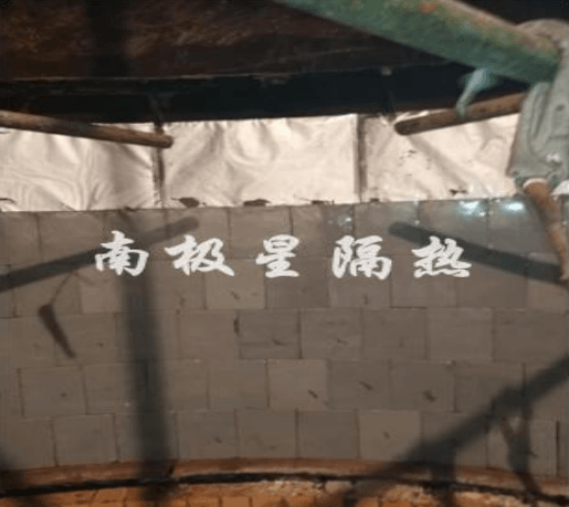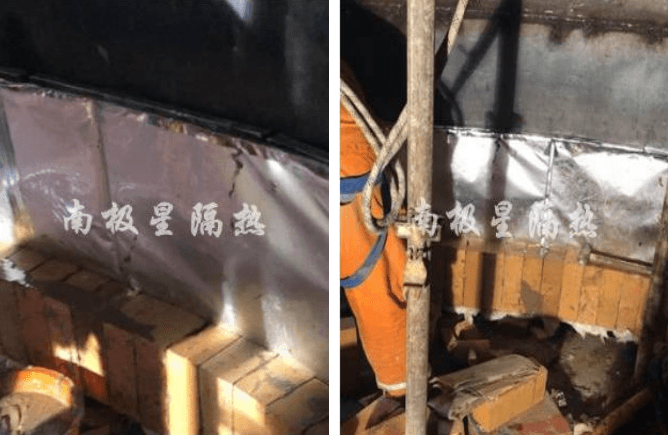 施工中,35mm納米隔熱板分兩層施工,一層25mm粘貼于鋼殼上,然后施工10mm的隔熱氈,兩層隔熱板錯縫施工。采用35mm納米隔熱板代替100mm的硅酸鈣板,內(nèi)部直徑增加130mm,容積增加了32立方米,外殼溫度由原來的120℃下降到80℃,降溫幅度為40℃,擴容和節(jié)能效果明顯,同時50天就收回了投資。