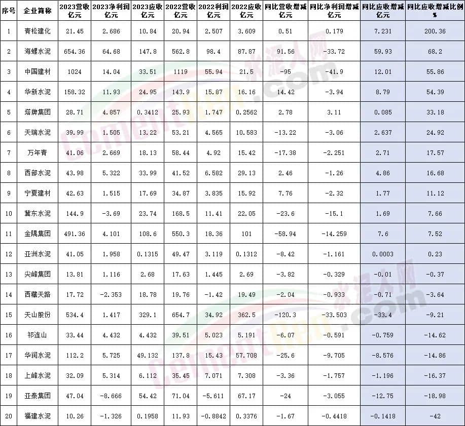 從應(yīng)收款規(guī)模來(lái)看,20家上市企業(yè)中12家應(yīng)收賬款增加,占比達(dá)60%。其中海螺水泥2023年上半年同比2022年同期應(yīng)收賬款及票據(jù)增加59.93億元,增幅達(dá)68.2%。同期營(yíng)業(yè)收入增加91.56億元,凈利潤(rùn)減少33.72億元,增收不增利的情況明顯。