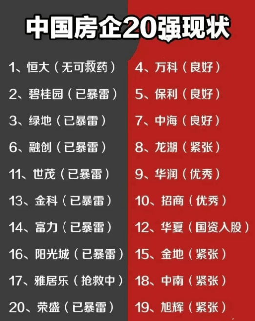 從前20強(qiáng)房企現(xiàn)狀可見(jiàn),目前9家企業(yè)已暴雷,1家搶救中,占比達(dá)50%。處于緊張狀態(tài)的4家企業(yè)。