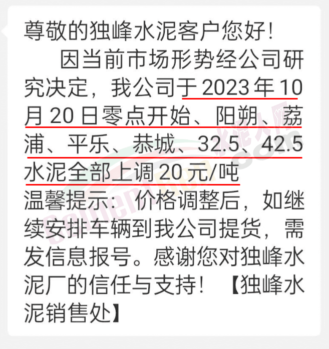 廣西桂林獨(dú)峰水泥通知,定于10月20日0時(shí)起,上調(diào)陽朔、荔浦、平樂、恭城、32.5、42.5水泥價(jià)格20元/噸。