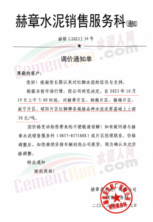 云南省昭通市彝良晨獅建材有限公司通知,根據(jù)目前市場(chǎng)形勢(shì)和公司生產(chǎn)實(shí)際情況,經(jīng)公司研究決定,從2023年10月21日8時(shí)起,對(duì)所有區(qū)域所有品種水泥價(jià)格上調(diào)30元/噸。