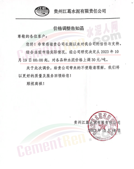 10月15日,江西萬年青、海螺、南方、錦象等上調(diào)10-20元/噸。