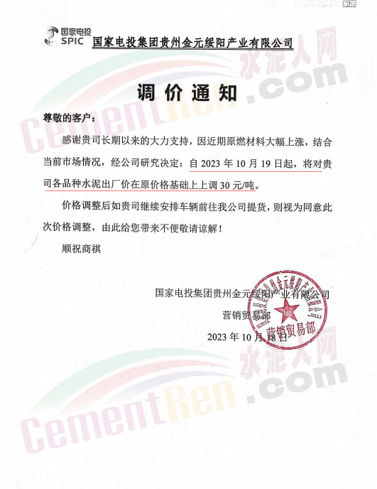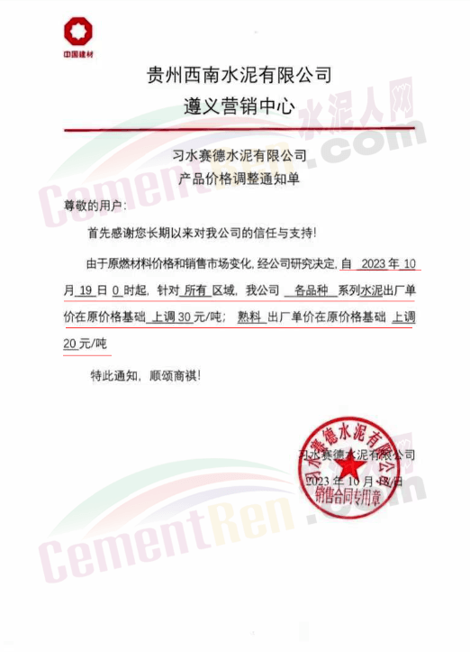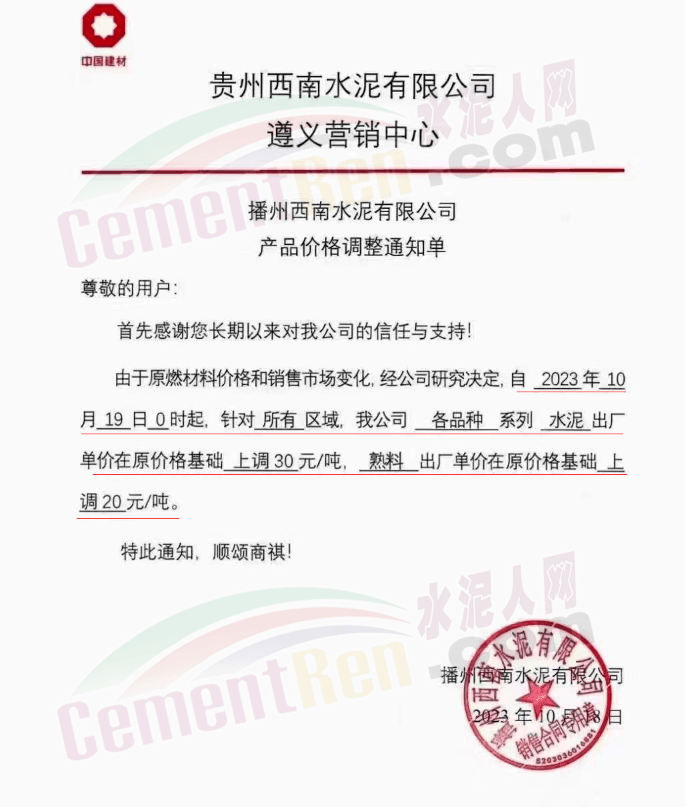 10月10日~18日,貴州海螺、紅獅、西南、尖峰、堯柏、明達(dá)、大方永貴、昊龍勝境、晴隆盤江等上調(diào)30元/噸。