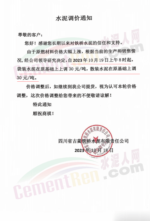 同日,四川省三藺鐵橋水泥通知,自19日起上調(diào)水泥報(bào)價(jià)30元/噸。