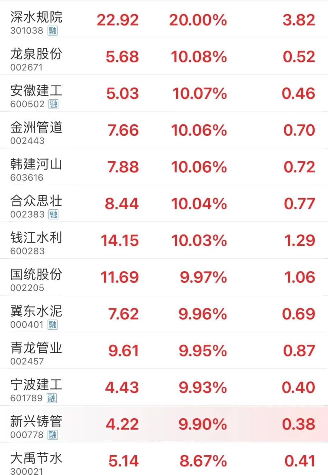 受增發(fā)1萬億元國(guó)債利好提振,A股聞“基”起舞,水利、水泥制造、基建、工程器械、鋼鐵、建筑等大基建產(chǎn)業(yè)鏈全線暴漲。 水利板塊中,深水規(guī)院以20%幅度漲停,龍泉股份、安徽建工、金洲管道、韓建河山、合眾思?jí)?、錢江水利、國(guó)統(tǒng)股份、冀東水泥、青龍管業(yè)等10余只個(gè)股漲停。