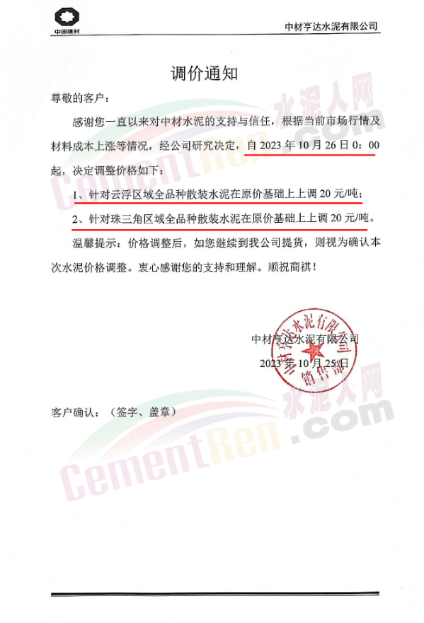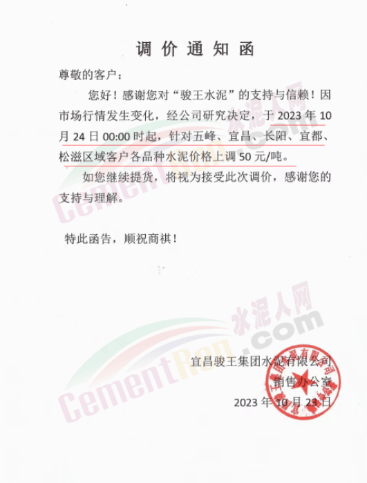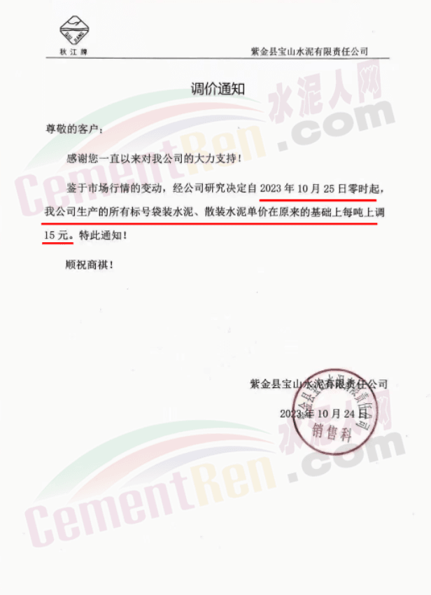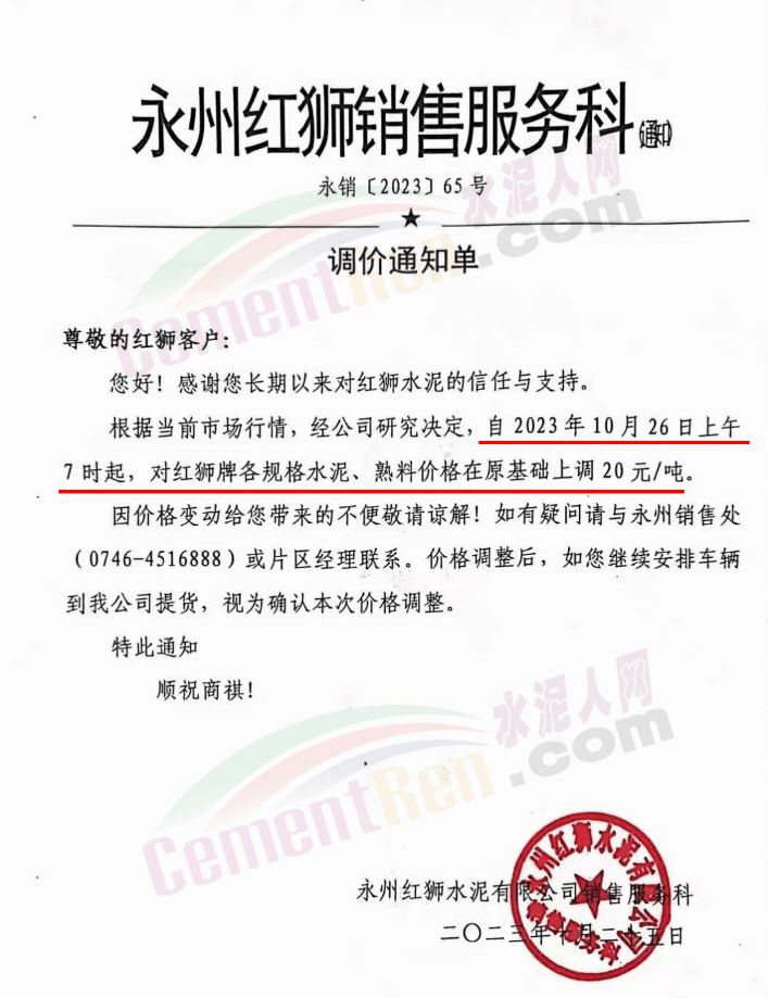 宜春紅獅通知,自10月26日起,對(duì)發(fā)往湖南長(zhǎng)株潭地區(qū)的各規(guī)格品種水泥報(bào)價(jià)上調(diào)20元/噸。