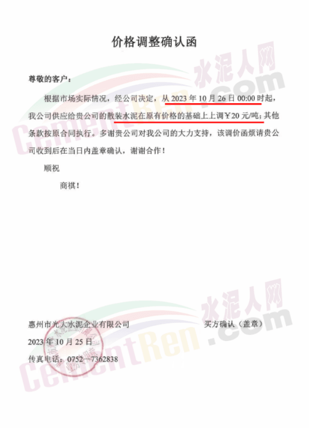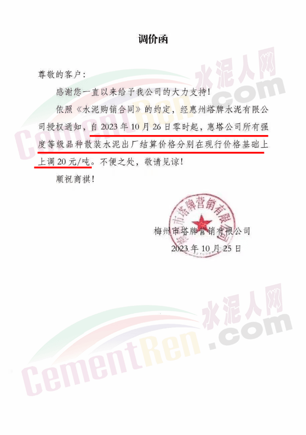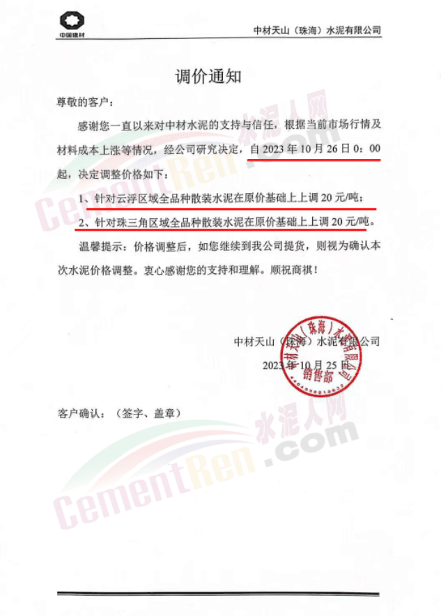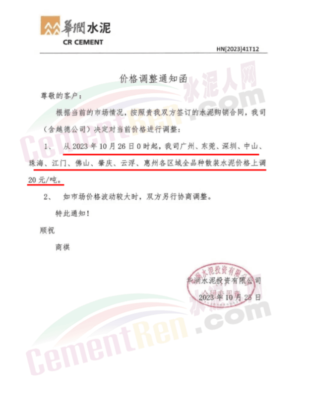 廣東珠三角及周邊區(qū)域中材、華潤(rùn)、塔牌、光大、臺(tái)泥等多家主要品牌企業(yè)通知自10月26日起上調(diào)水泥報(bào)價(jià)15~20元/噸。