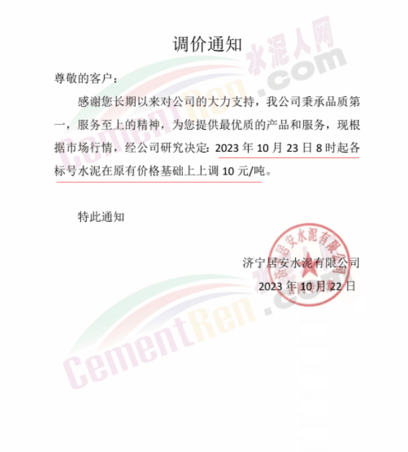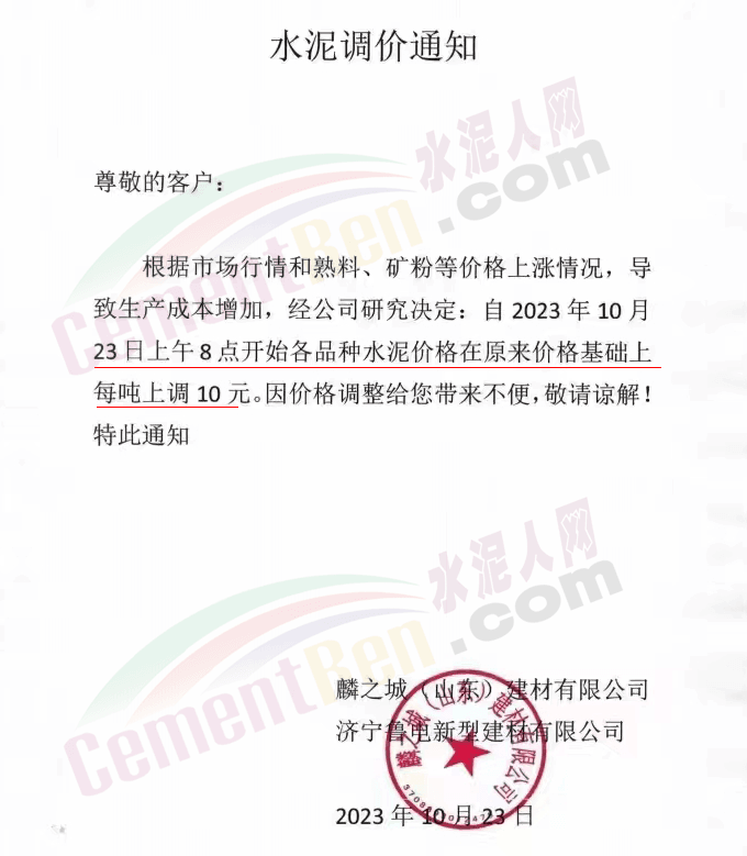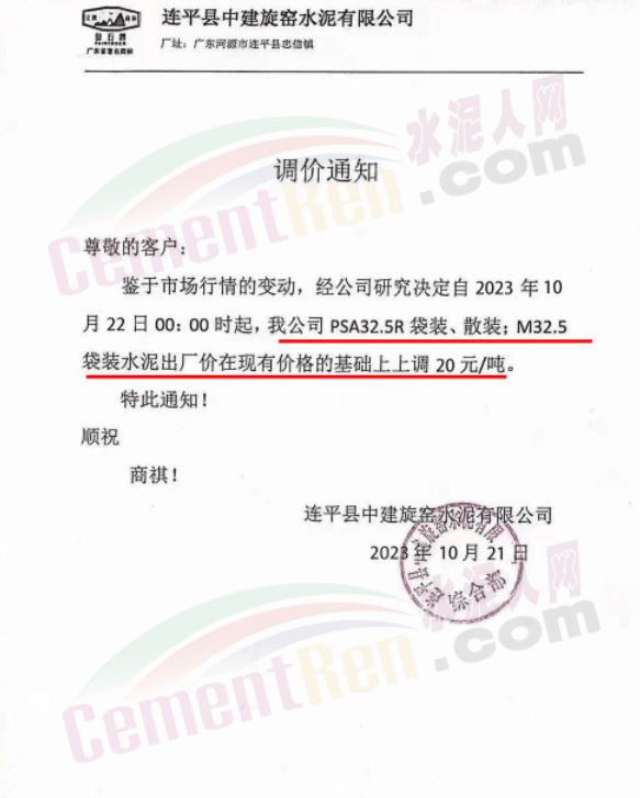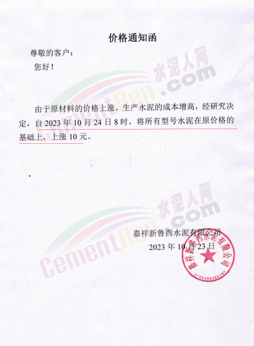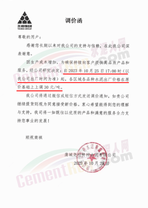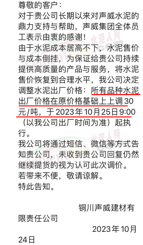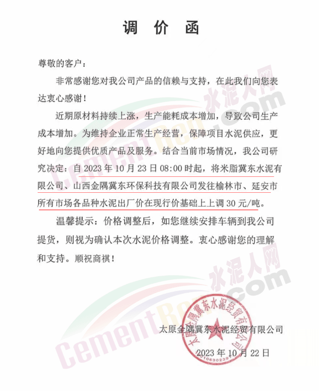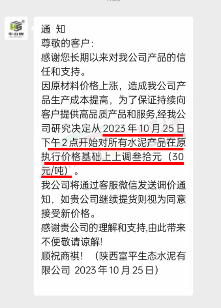 金隅冀東經(jīng)貿(mào)公司通知,由于近期原材料持續(xù)上漲,生產(chǎn)能耗成本增加,導(dǎo)致公司生產(chǎn)成本增加。為維持企業(yè)正常生產(chǎn)經(jīng)營(yíng),保障項(xiàng)目水泥供應(yīng),經(jīng)研究決定自2023年10月23日8時(shí)起,將米脂冀東水泥有限公司、山西金隅冀東環(huán)??萍加邢薰景l(fā)往榆林市、延安市所有市場(chǎng)各品種水泥出廠價(jià)上調(diào)30元/噸。