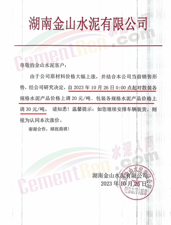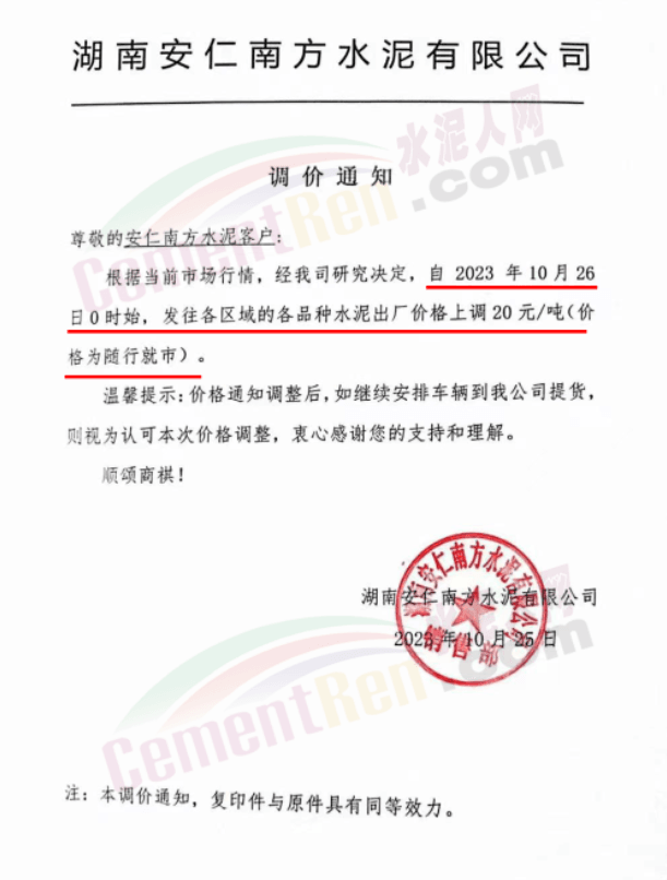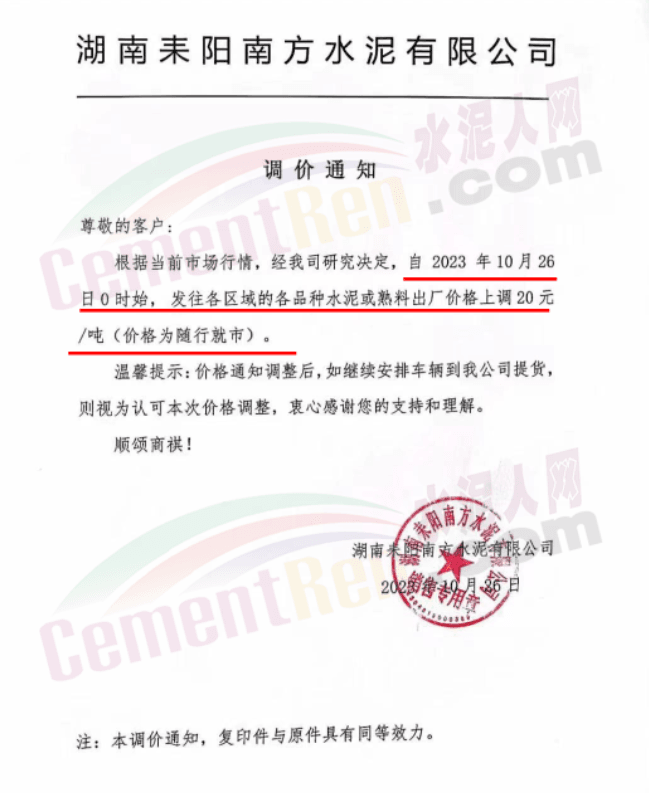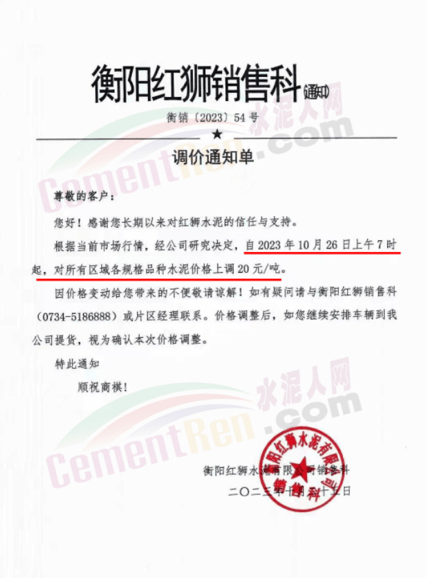 湖南耒陽(yáng)南方、安仁南方、衡陽(yáng)紅獅、永州紅獅、金山水泥等通知,自10月26日起上調(diào)水泥和熟料報(bào)價(jià)20元/噸。