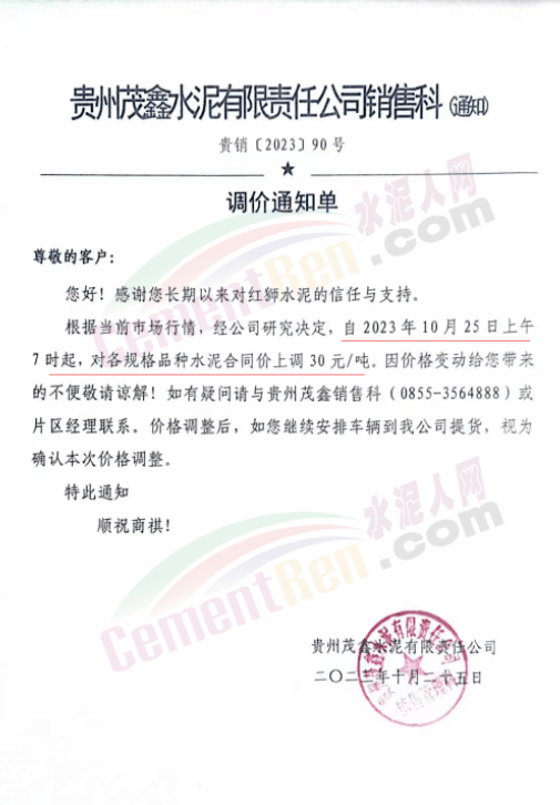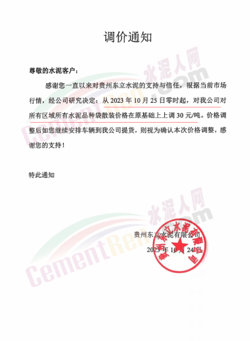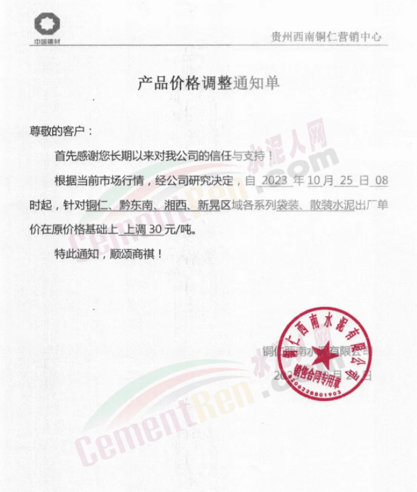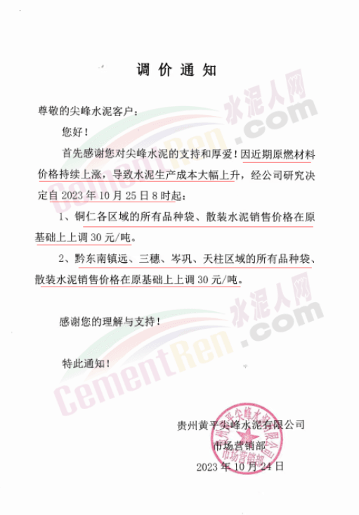 貴州銅仁、黔東南等區(qū)域茂鑫紅獅、黃平尖峰、銅仁西南、貴州東立等多家主要品牌水泥企業(yè)再次通知上調(diào)水泥報(bào)價(jià)30元/噸。企業(yè)調(diào)價(jià)通知稱,因近期原燃材料價(jià)格持續(xù)上漲,導(dǎo)致水泥生產(chǎn)成本大幅上升,經(jīng)公司研究決定自10月25日起各品種水泥價(jià)格上調(diào)30元/噸。