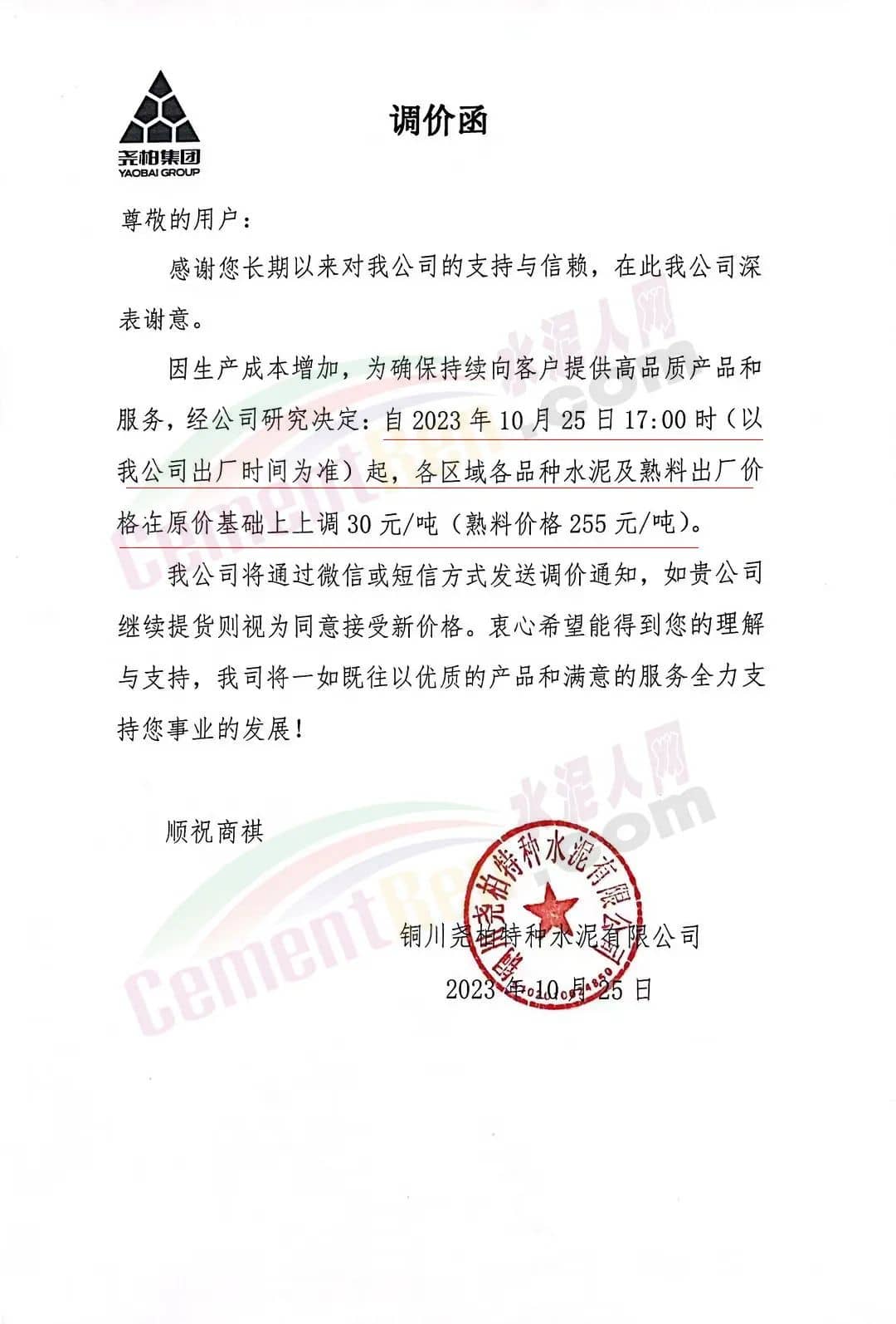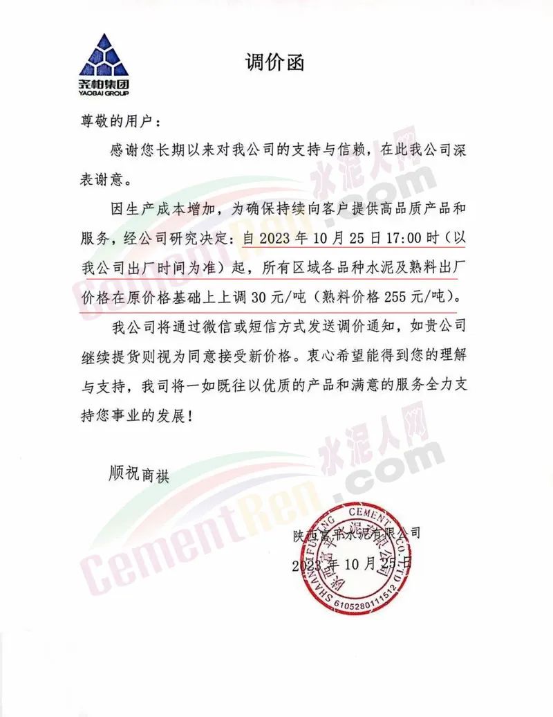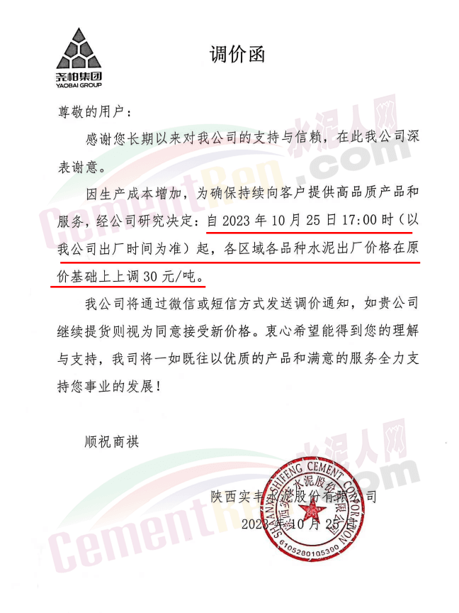 陜西銅川堯柏水泥、富平水泥、蒲城堯柏、實(shí)豐水泥、富平生態(tài)水泥、銅川聲威建材等主要品牌企業(yè)通知,因生產(chǎn)成本增加,自10月25日起各區(qū)域各品種水泥及熟料出廠價(jià)上調(diào)30元/噸(熟料價(jià)格255元/噸)。
