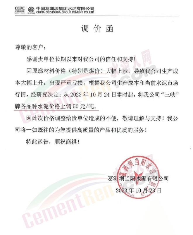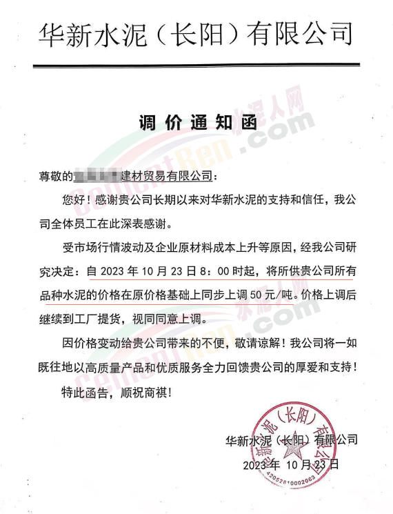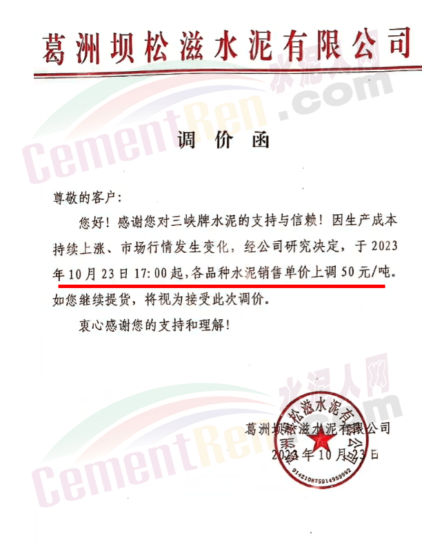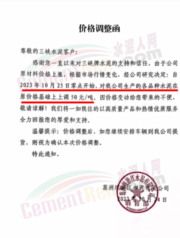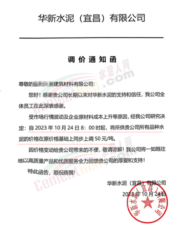 湖北華新水泥、葛洲壩水泥、駿王水泥等通知上調(diào)水泥報(bào)價(jià)50元/噸。