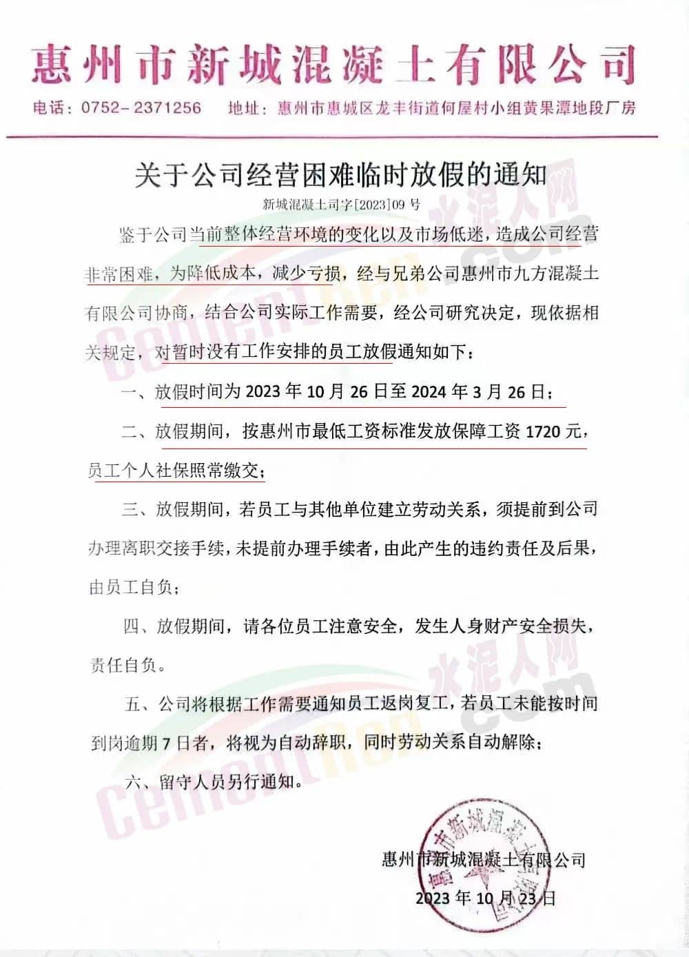 日前,廣東惠州市新城混凝土有限公司發(fā)布《關(guān)于公司經(jīng)營(yíng)困難臨時(shí)放假的通知》稱,鑒于公司當(dāng)前整體經(jīng)營(yíng)環(huán)境的變化以及市場(chǎng)低迷,造成公司經(jīng)營(yíng)非常困難,為降低成本,減少虧損,經(jīng)與兄弟公司惠州市九方混凝土有限公司協(xié)商,結(jié)合公司實(shí)際工作需要,對(duì)暫時(shí)沒有工作安排的員工從2023年10月26日至2024年3月26日放假。放假期間,按惠州市最低工資標(biāo)準(zhǔn)發(fā)放保障工資1720元,員工個(gè)人社保照常繳交。