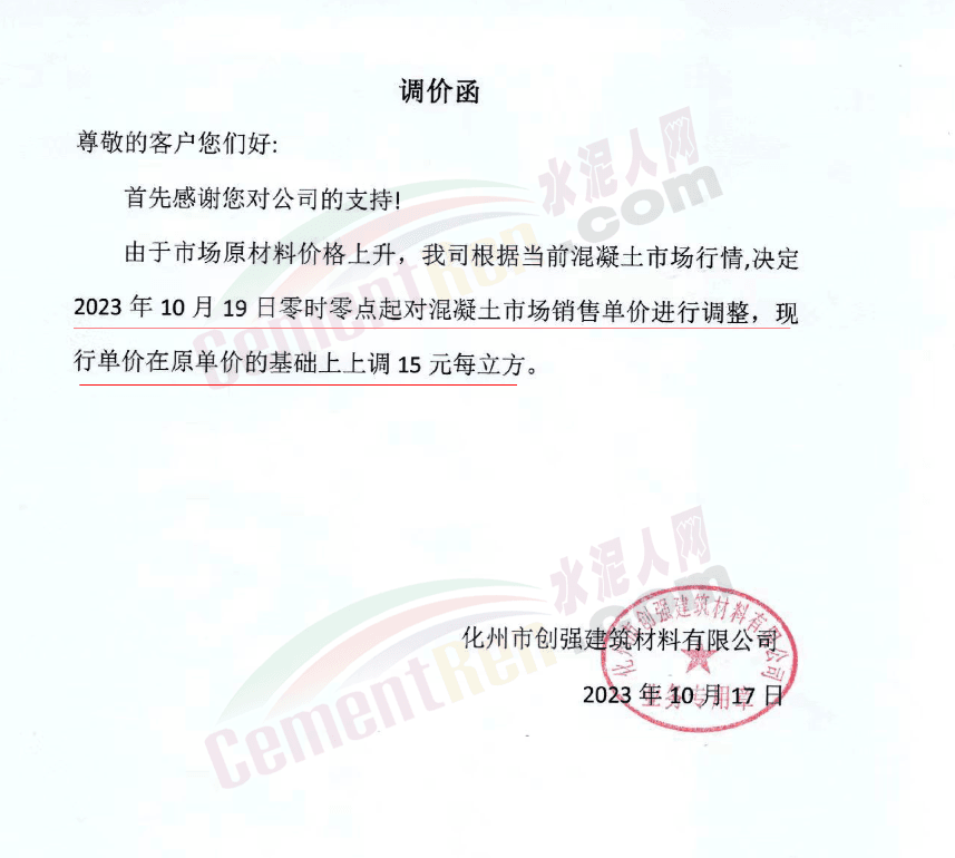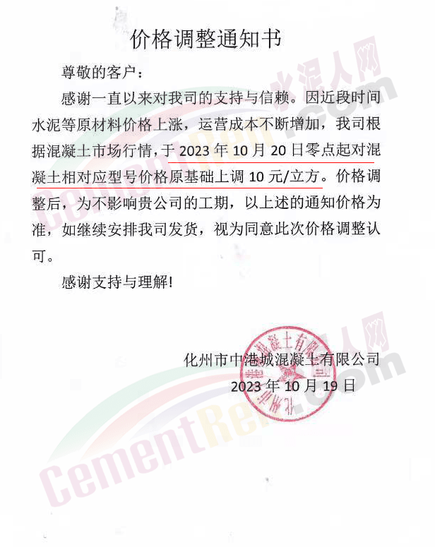 茂名化州區(qū)域混凝土企業(yè)調(diào)價(jià)通知稱,因近段時(shí)間原材料價(jià)格上漲,運(yùn)營(yíng)成本不斷增加,根據(jù)混凝土市場(chǎng)行情,上調(diào)各型號(hào)混凝土報(bào)價(jià)10~15元/立方。