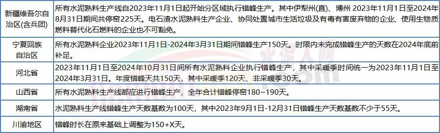 近期,新疆、寧夏等多地公布了2023-2024年錯(cuò)峰生產(chǎn)計(jì)劃。水泥人網(wǎng)注意到,各區(qū)域的停產(chǎn)時(shí)間明顯延長,停產(chǎn)要求明顯加嚴(yán)。