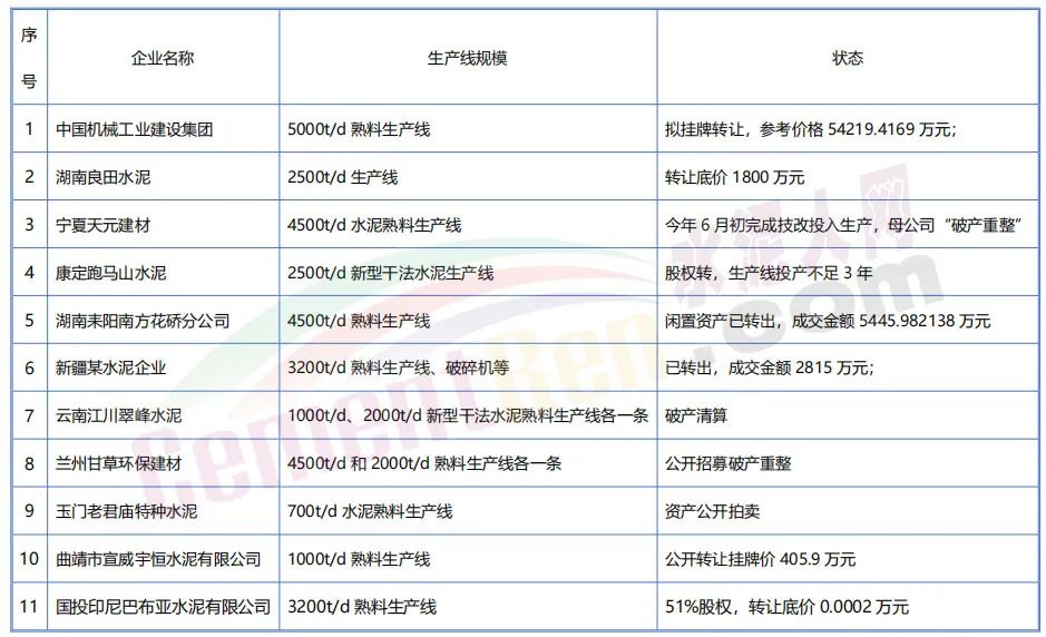 與此同時(shí),多家水泥企業(yè)股權(quán)、指標(biāo)、設(shè)備資產(chǎn)登上拍賣平臺(tái)。其中不乏2500t/d及以上規(guī)格熟料生產(chǎn)線,甚至還包含5000t/d生產(chǎn)線。
