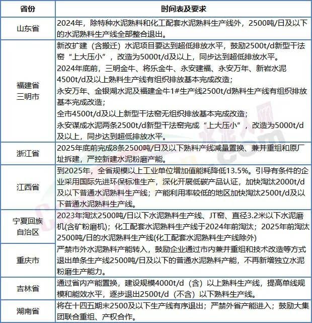 據(jù)水泥人網(wǎng)近期消息,繼山東省出臺(tái)計(jì)劃,明確2500t/d及以下水泥熟料生產(chǎn)線退出的時(shí)間后,福建、浙江、吉林、江西、寧夏、湖南多地也發(fā)布了2500t/d及以下水泥熟料生產(chǎn)線退出的時(shí)間表。