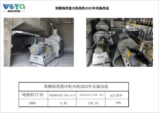 3.運(yùn)行效率提高:改造后,篦冷機(jī)風(fēng)機(jī)的運(yùn)行效率達(dá)到了84%。這表明設(shè)備的性能得到了顯著提升,生產(chǎn)過程更為高效,減少了資源的浪費(fèi)。