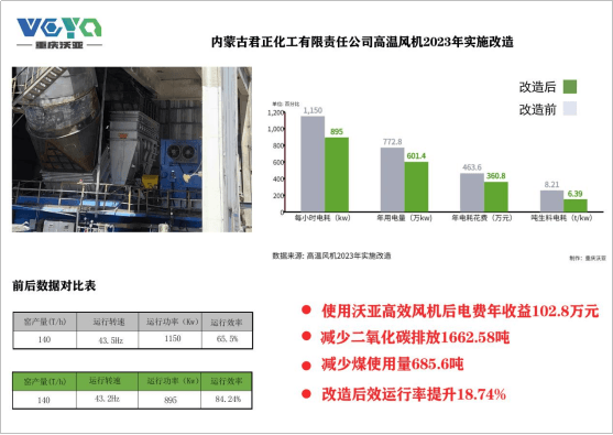 內(nèi)蒙古君正化工有限責(zé)任公司水泥分公司的高效節(jié)能高溫風(fēng)機(jī)技改項(xiàng)目通過沃亞高效風(fēng)機(jī)的應(yīng)用,不僅取得了顯著的經(jīng)濟(jì)效益,還為環(huán)境保護(hù)和資源節(jié)約做出了積極貢獻(xiàn)。這一項(xiàng)目的成功案例表明,投資于技術(shù)改進(jìn)和節(jié)能措施不僅有助于企業(yè)提高競爭力,還有助于社會(huì)的可持續(xù)發(fā)展。以下是詳細(xì)數(shù)據(jù)說明: