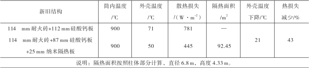 采用納米隔熱板替換原硅酸鈣板一段時間后發(fā)現(xiàn),C5旋風(fēng)筒散熱損失減少336W/m2,外殼溫度下降21℃,熱損失減少43%,加強(qiáng)耐火襯的隔熱效果。