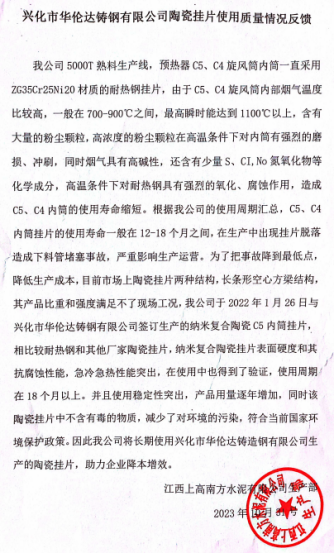 礦峰水泥1#線C5A自2020年7月份開始使用江蘇凱達(dá)的納米復(fù)合高強(qiáng)度陶瓷內(nèi)筒掛片,至今已使用3年零3個月,運(yùn)行穩(wěn)定,中間沒有進(jìn)行過一次維修。此前使用市場上長條形陶瓷產(chǎn)品很不理想,使用效果不好,日常運(yùn)行易損壞、維護(hù)量大。