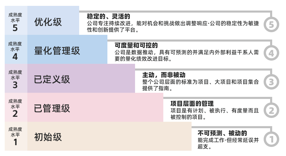 ▲ CMMI的5個(gè)級(jí)別及標(biāo)準(zhǔn)