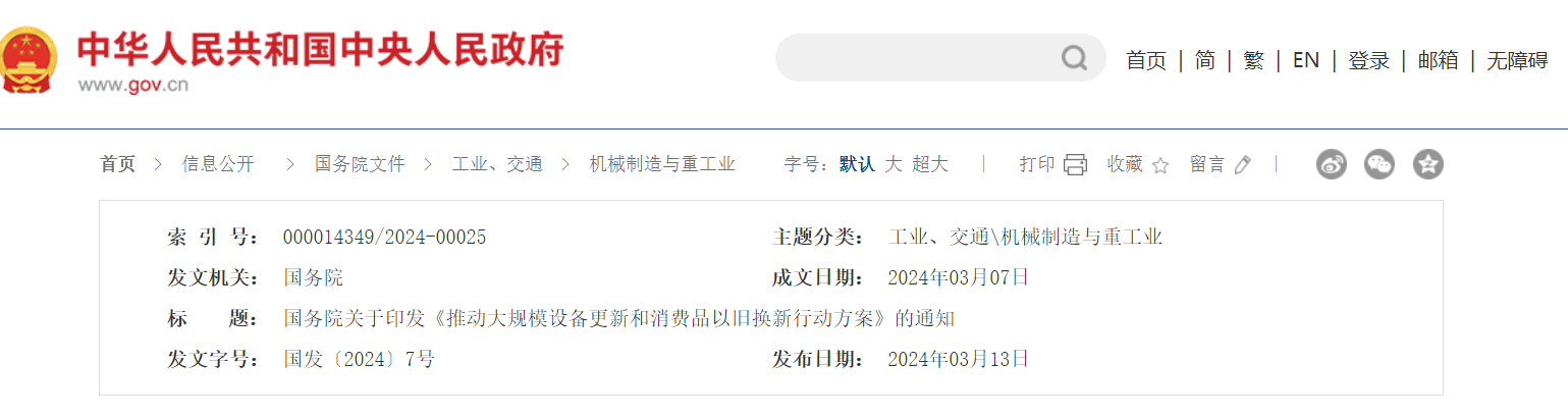 國(guó)務(wù)院關(guān)于印發(fā)《推動(dòng)大規(guī)模設(shè)備更新和