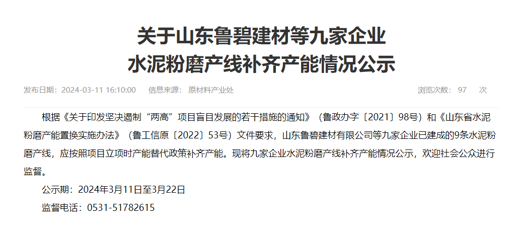 日前,山東省工信廳發(fā)布《關(guān)于山東魯碧建材等九家企業(yè)水泥粉磨產(chǎn)線補齊產(chǎn)能情況公示》稱,根據(jù)《關(guān)于印發(fā)堅決遏制“兩高”項目盲目發(fā)展的若干措施的通知》(魯政辦字〔2021〕98號)和《山東省水泥粉磨產(chǎn)能置換實施辦法》(魯工信原〔2022〕53號)文件要求,山東魯碧建材有限公司等九家企業(yè)已建成的9條水泥粉磨產(chǎn)線,應(yīng)按照項目立項時產(chǎn)能替代政策補齊產(chǎn)能?,F(xiàn)將九家企業(yè)水泥粉磨產(chǎn)線補齊產(chǎn)能情況公示,歡迎社會公眾進行監(jiān)督。公示期:2024年3月11日至3月22日,監(jiān)督電話:0531-51782615