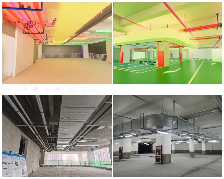 項目利用BIM 技術(shù),將建筑、結(jié)構(gòu)、機(jī)電模型集成后,開展管線碰撞檢查、吊頂標(biāo)高控制等,通過碰撞檢查,形成綜合報告,進(jìn)行設(shè)計優(yōu)化,出具綜合管線排布圖紙,遵照管道避讓原則,做到實體效果整齊美觀。