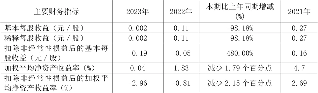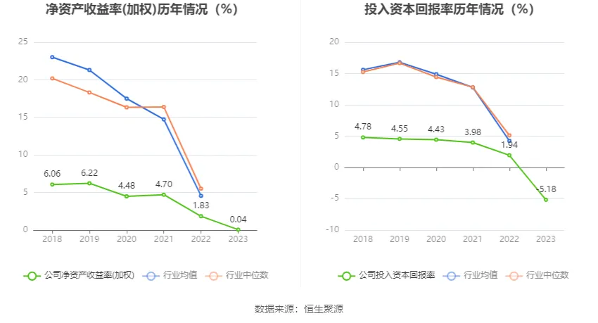 數(shù)據(jù)顯示,2023年公司加權(quán)平均凈資產(chǎn)收益率為0.04%,較上年同期下降1.79個(gè)百分點(diǎn);公司2023年投入資本回報(bào)率為-5.18%,較上年同期下降7.12個(gè)百分點(diǎn)。