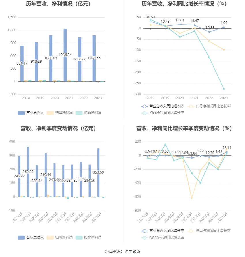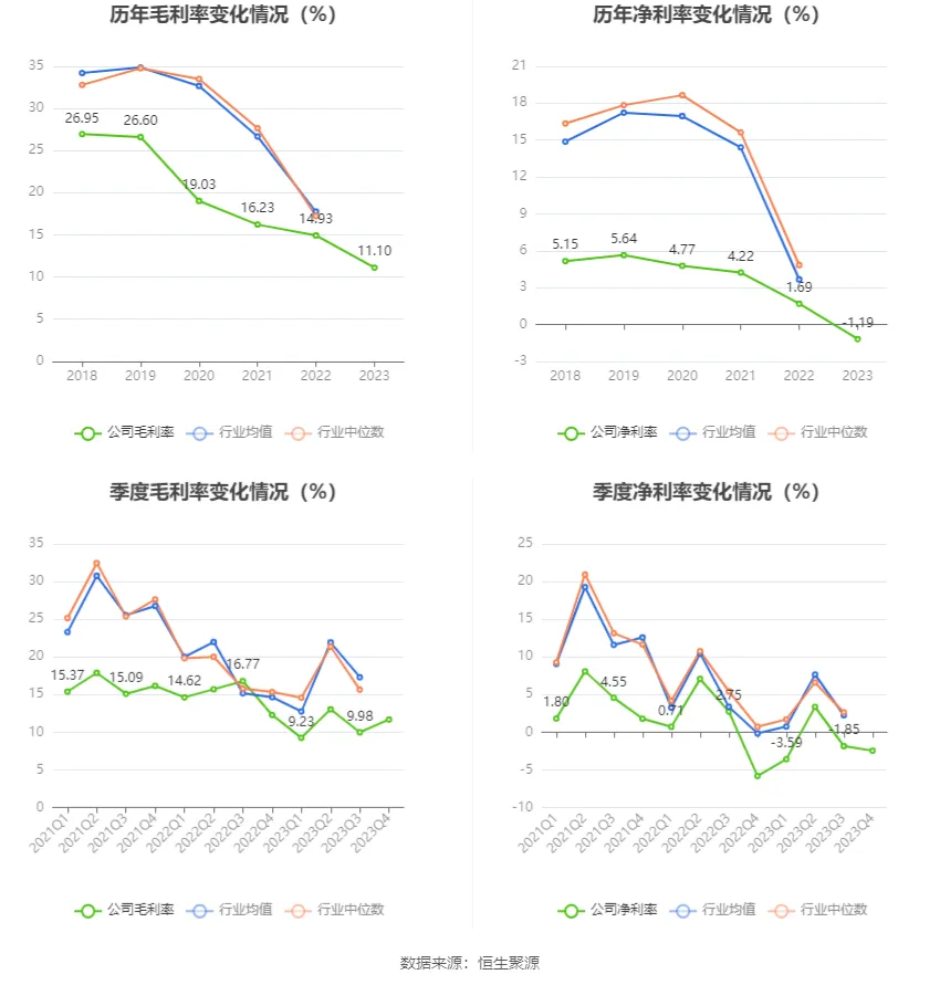 2023年,公司毛利率為11.10%,同比下降3.83個(gè)百分點(diǎn);凈利率為-1.19%,較上年同期下降2.88個(gè)百分點(diǎn)。從單季度指標(biāo)來看,2023年第四季度公司毛利率為11.68%,同比下降0.60個(gè)百分點(diǎn),環(huán)比上升1.70個(gè)百分點(diǎn);凈利率為-2.46%,較上年同期上升3.37個(gè)百分點(diǎn),較上一季度下降0.61個(gè)百分點(diǎn)。