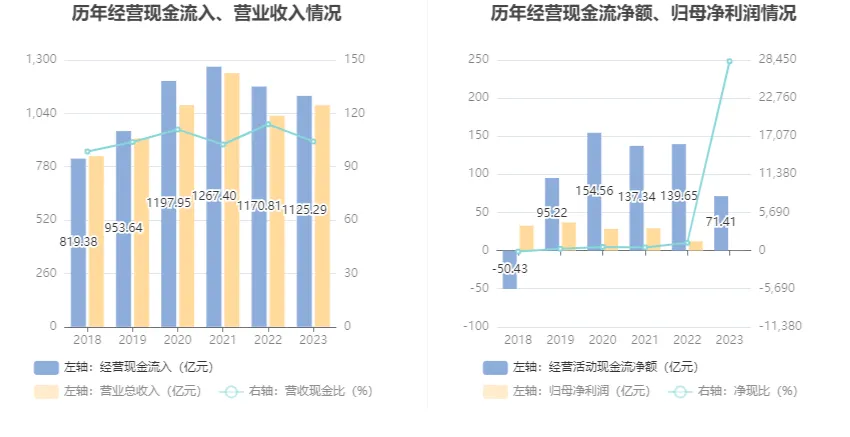 2023年,公司營(yíng)業(yè)收入現(xiàn)金比為104.24%,凈現(xiàn)比為28265.92%。