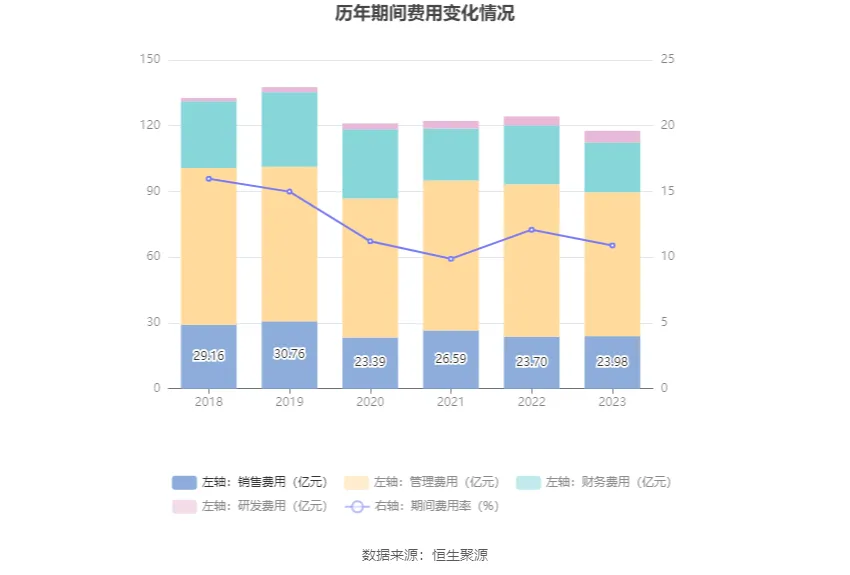 2023年,公司期間費(fèi)用為117.69億元,較上年同期減少6.57億元;期間費(fèi)用率為10.90%,較上年同期下降1.19個(gè)百分點(diǎn)。其中,銷售費(fèi)用同比增長(zhǎng)1.18%,管理費(fèi)用同比下降5.64%,研發(fā)費(fèi)用同比增長(zhǎng)29.27%,財(cái)務(wù)費(fèi)用同比下降15.35%。