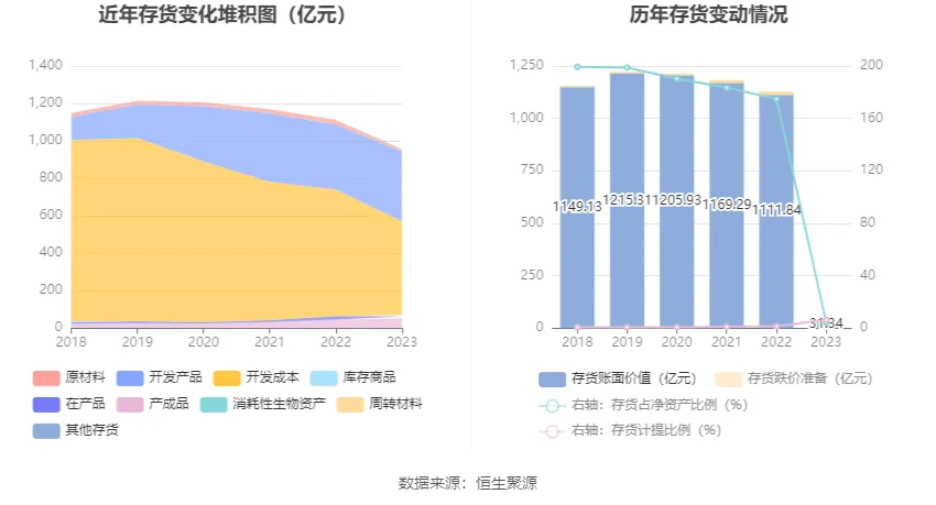從存貨變動(dòng)來看,截至2023年年末,公司存貨賬面價(jià)值為31.34億元,占凈資產(chǎn)的4.29%,較上年末減少1080.5億元。其中,存貨跌價(jià)準(zhǔn)備為2.13億元,計(jì)提比例為6.36%。