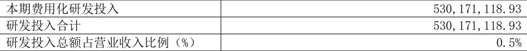 2023年全年,公司研發(fā)投入金額為5.30億元,同比增長(zhǎng)369.48%;研發(fā)投入占營(yíng)業(yè)收入比例為0.50%,相比上年同期上升0.17個(gè)百分點(diǎn)。此外,公司全年研發(fā)投入資本化率為0。