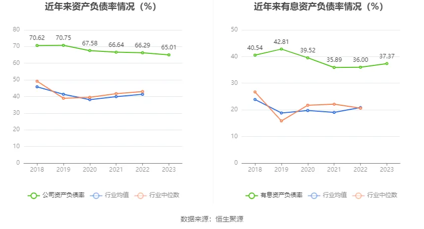 在償債能力方面,公司2023年年末資產(chǎn)負(fù)債率為65.01%,相比上年末下降1.28個(gè)百分點(diǎn);有息資產(chǎn)負(fù)債率為37.37%,相比上年末上升1.37個(gè)百分點(diǎn)。
