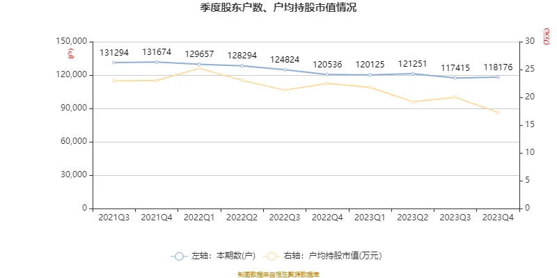 籌碼集中度方面,截至2023年末,公司股東總戶數(shù)為11.82萬戶,較三季度末增長(zhǎng)了761戶,增幅0.65%;戶均持股市值由三季度末的20.01萬元下降至17.26萬元,降幅為13.74%。