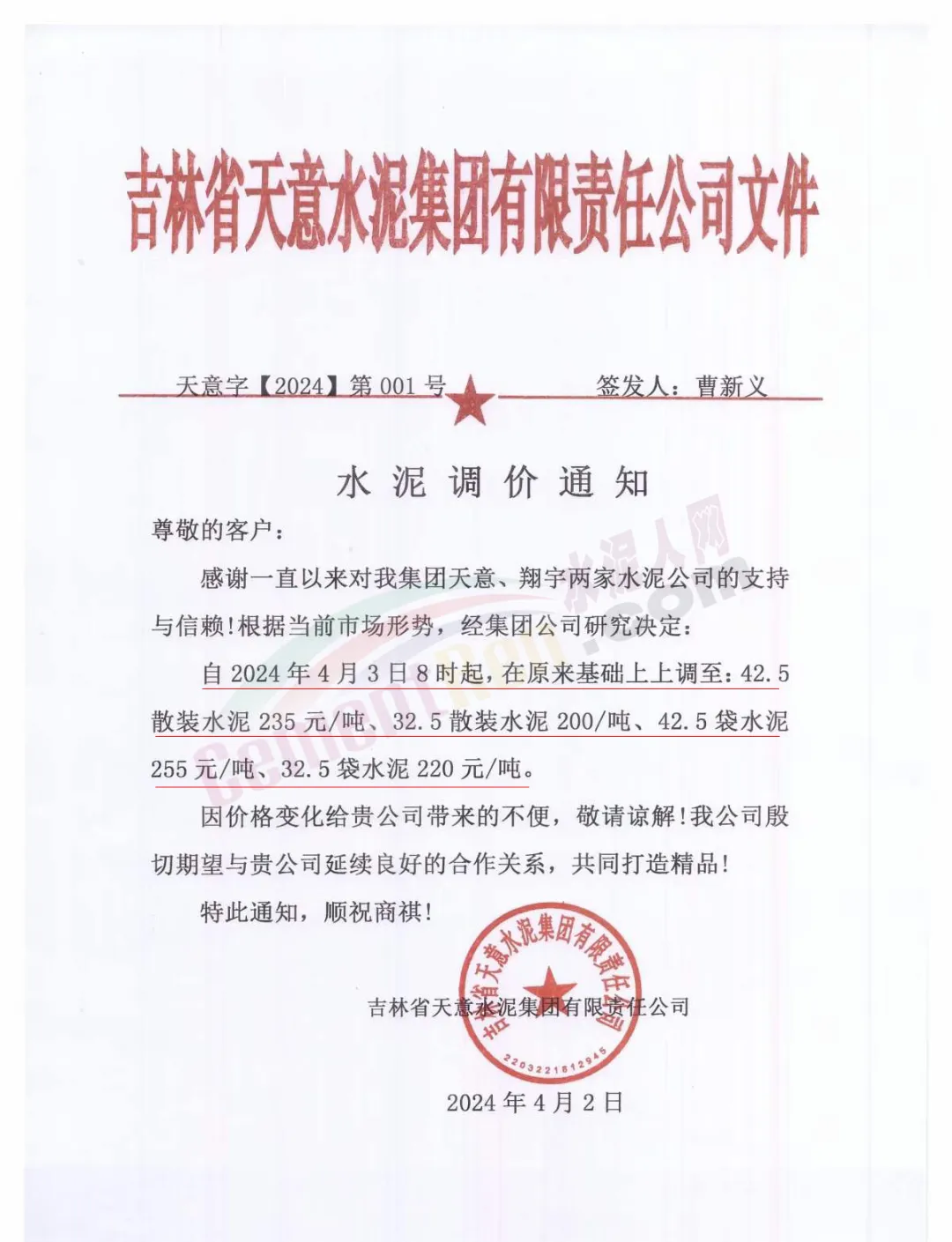 吉林天意水泥通知,自2024年4月3日8時(shí)起,在原來(lái)基礎(chǔ)上上調(diào)水泥報(bào)價(jià)。上調(diào)后,42.5散裝水泥235元/噸、32.5散裝水泥200/噸、42.5袋水泥255元/噸、32.5袋水泥220元/噸。